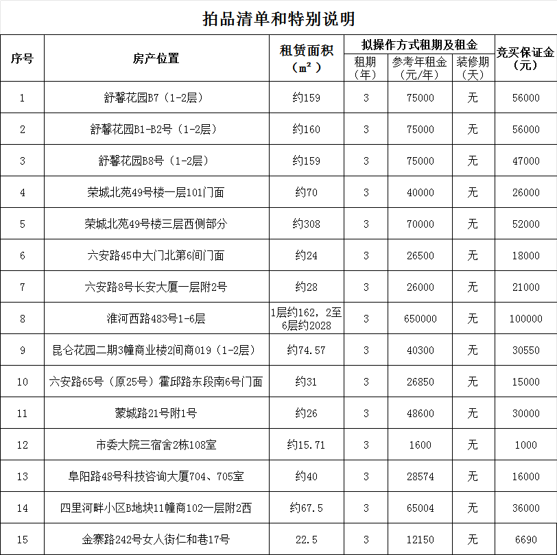 一、拍卖标的:位于合肥市舒馨花园B7(1-2层)等15间门面租赁权(房产面积、年租金参考价、竞买保证金等信息详见拍品清单和特别说明)。